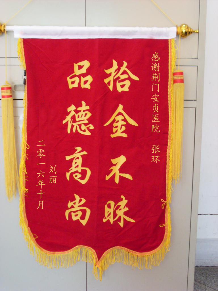 2016年10月15日,我院职工张环收到体检人员刘丽赠送的锦旗一面,以感谢张环同志捡到戒指原物归还、拾金不昧的精神,医院决定对其全院通报表彰和奖励,并号召全体职工向其学习,服务好每一位患者,特给与张环一百元的经济奖励。
